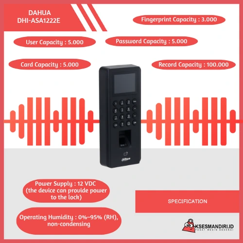 Deskripsi Produk | DH-304FPIA adalah perangkat akses kontrol standalone untuk satu pintu dengan autentikasi kartu Mifare (IC), sidik jari, password, dan kombinasi multi-user. Dilengkapi layar LCD 2.4 inci, mendukung hingga 5.000 pengguna, serta fitur keamanan seperti tamper alarm, duress alarm, anti-passback, dan alarm pelanggaran. |